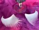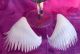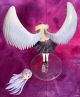 The wings don't fit into her back's slots very well. They only insert partially (slots are too tight/small?), and tend to fall out. You can remove the head, attach the wings as best you can, then push the head down carefully. We tried using a hair dryer (not included), but not much luck. Perhaps using some white tac might help (not included). Or, display her without the wings.